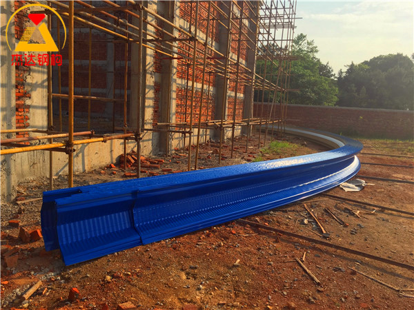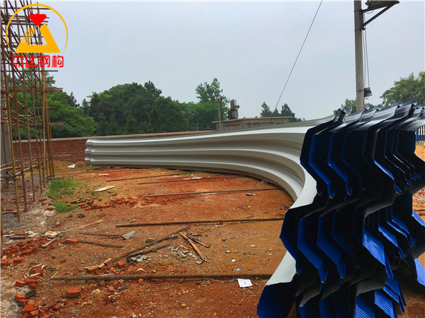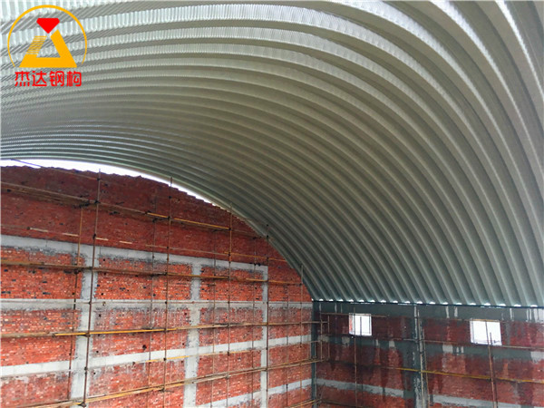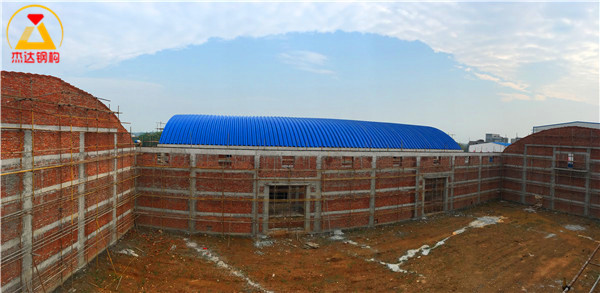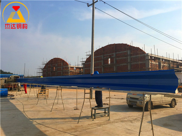 位于高安黃沙鎮糧食烘干廠內的拱形屋頂使用直徑24mm的螺紋鋼作為預埋,使用6mm厚的托板,4棟拱形屋頂均使用1.2mm厚TS280GD-Z彩涂卷進行制作安裝。