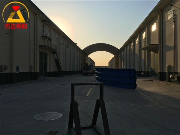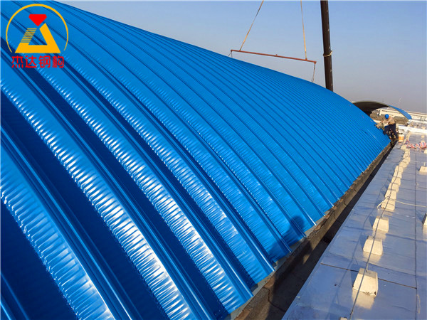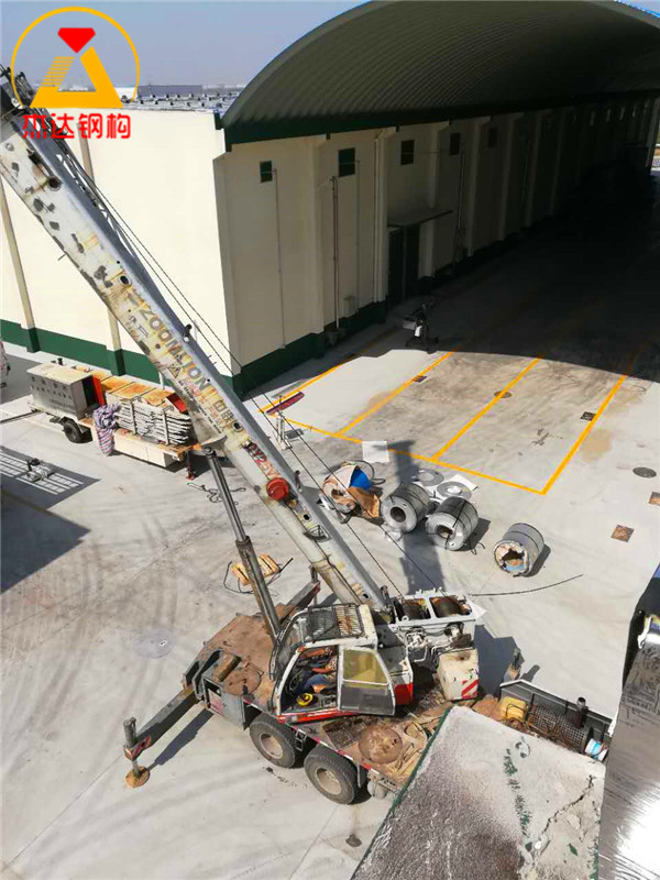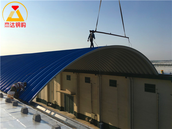 杰達鋼構承接建設單位拱形屋頂波紋鋼屋蓋安裝勞務,提供1.0mm厚高強彩涂卷,焊接托板,并制作安裝矢跨比為0.2的拱形屋頂。