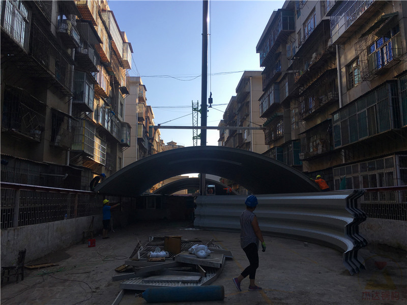 由于本工程施工地點位于小區內,人來人往施工不變,杰達鋼構施工人員在施工時面臨著現場來往人員負責,施工地點狹窄等問題,但好在杰達鋼構施工人員經驗豐富,連夜加班,僅用5天完成了車棚拱形屋頂的拆換工作,收到了業主與小區內人員的一致好評。