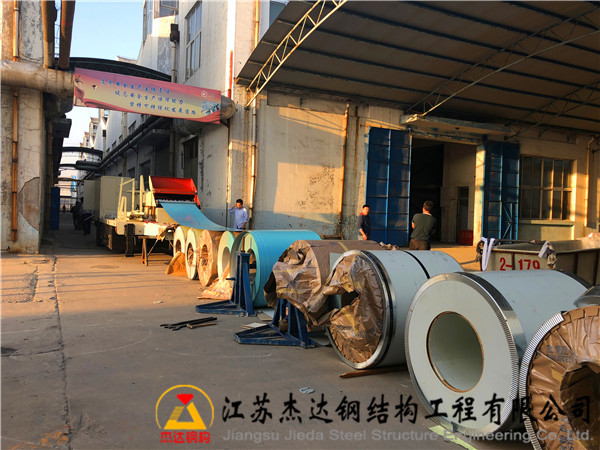 我們的施工人員將設(shè)備放置到為之后,又將我們的寶鋼彩涂卷放置到位,這個(gè)彩涂卷是寶鋼天藍(lán)色的彩涂卷,整齊有序的排列在我們的壓瓦機(jī)后面。