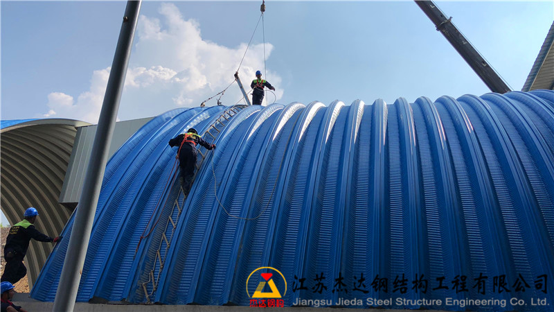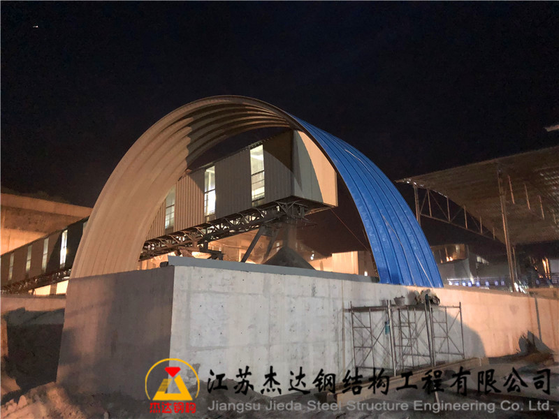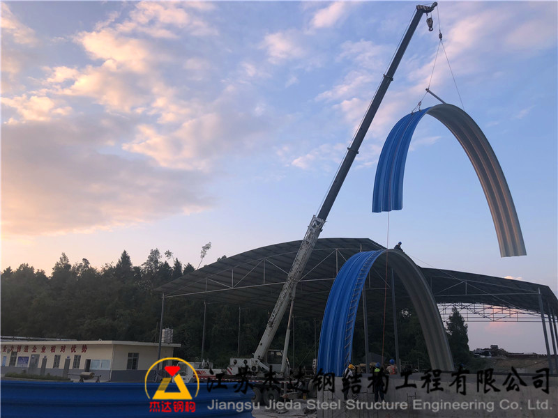 概況:該拱形屋頂位于重慶豐都重水礦山內,屋頂的跨度是19米,拱高是8米,該拱形屋頂使用的板厚是1.2mm厚,下部使用的連接板的厚度是10mm厚。