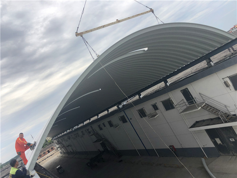 概況:該拱形屋頂的跨度為16米,長度為120米,建筑面積為1920平方米。使用的是臺灣尚興0.9mm的TS280GD-Z高強彩涂卷,顏色為白色。該拱形屋頂倉間罩棚需要安裝山墻,山墻亦是使用屋面的白色彩鋼瓦壓制而成。