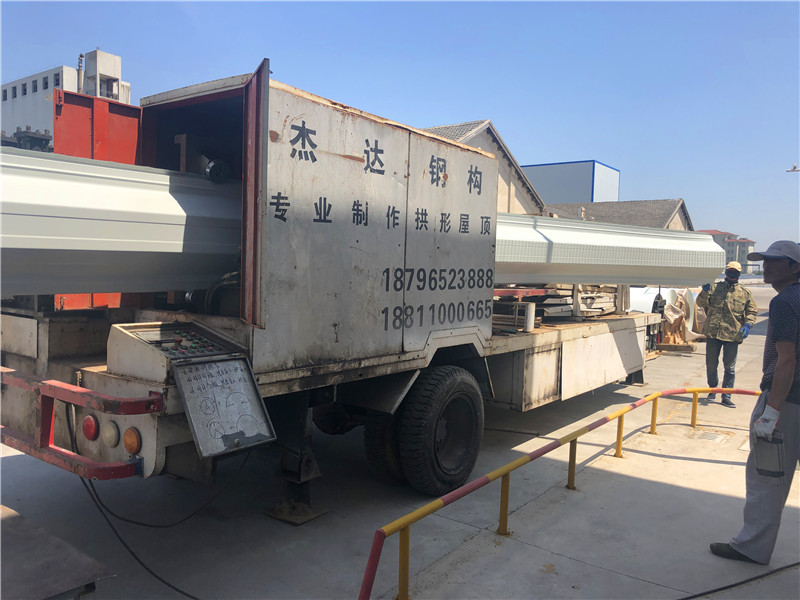 圖片二:江蘇杰達鋼結構工程有限公司的拱形屋頂壓制設備已經抵達現場,并正在壓制拱形屋頂單元瓦片。