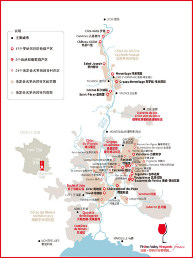 此外,北羅納河谷的圣約瑟夫(Saint-Joseph)、埃米塔日(Hermitage)和克羅茲-埃米塔日(Crozes-Hermitage)等村莊也是出產高品質西拉紅葡萄酒的著名產區。