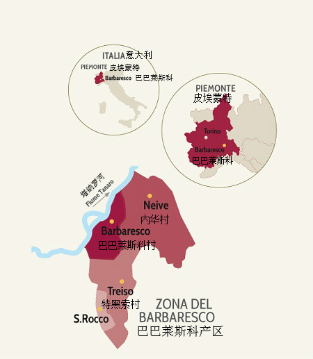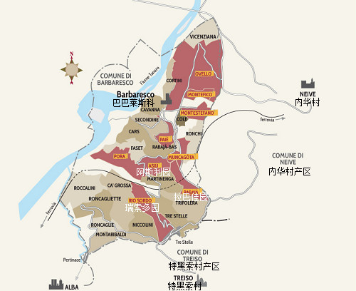 巴巴萊斯科的葡萄園面積僅為巴羅洛的1/3,主要分布在巴巴萊斯科村、內華村(Neive)和特黑索村(Treiso)三大著名村莊內。因地理位置不同,這些村莊的風土條件略有差異:巴巴萊斯科村緊鄰塔納羅河,氣候比較溫和;內華村土壤類型多樣,除了鄰近巴巴萊斯科村的葡萄園之外,這里大部分葡萄園的土壤富含沙石;而特黑索村在高海拔和森林的調節下,氣候最為涼爽。
