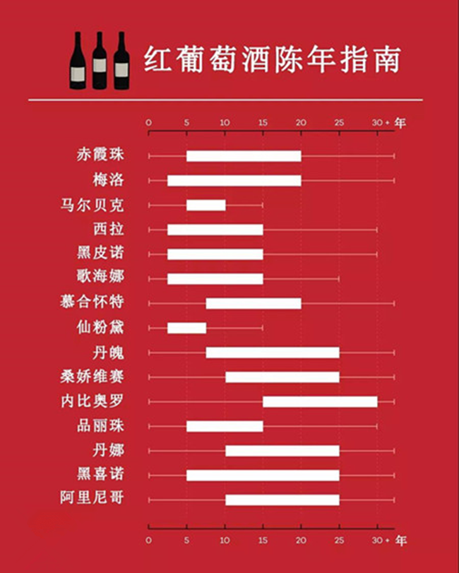 以上紅葡萄酒的陳年影響因素與葡萄品種本身有很大的關系,以下是一個簡潔版的紅葡萄品種的陳年指南,僅供參考: