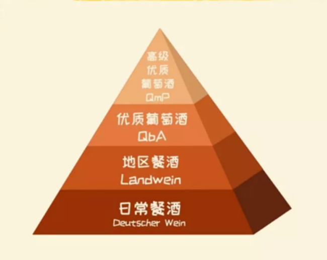 官方分級由1971年頒布的《德國葡萄酒法案》確立,適用于德國生產的所有葡萄酒,根據該分級制度,德國葡萄酒等級由低到高共分為:日常餐酒(Deutscher Wein)、地區餐酒(Landwein)、優質葡萄酒(Qualitatswein bestimmter Anbaugebiete,簡稱QbA)和高級優質葡萄酒(Qualitatswein mit Pradikat,簡稱QmP),其中高級優質葡萄酒也被稱作“ Pradikatswein”。