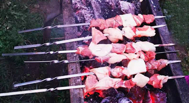 烤羊肉串是一種流行于中東、南亞、中亞、地中海、東亞等多個地區(qū)的羊肉菜式。在中國,烤羊肉串的歷史可追溯至東漢時期,20世紀80年代以來隨著時代的發(fā)展,在大江南北傳揚開來。烤羊肉串看似簡單,要保證羊肉既入味又鮮嫩卻并非易事,工序也十分考究——取新鮮羊肉或切片切塊,串穿在細鐵釬上,放置在烤爐上焙烤,再撒上些辣子面、胡椒粉和孜然粉等,不斷翻動,烤至雙面金黃,肉質熟透。