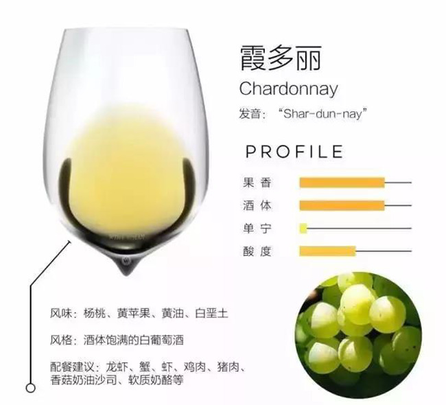 霞多麗是一款源自法國的干型、飽滿的白葡萄酒。經(jīng)過橡木桶熟成的霞多麗會有奶油和黃油的味道。