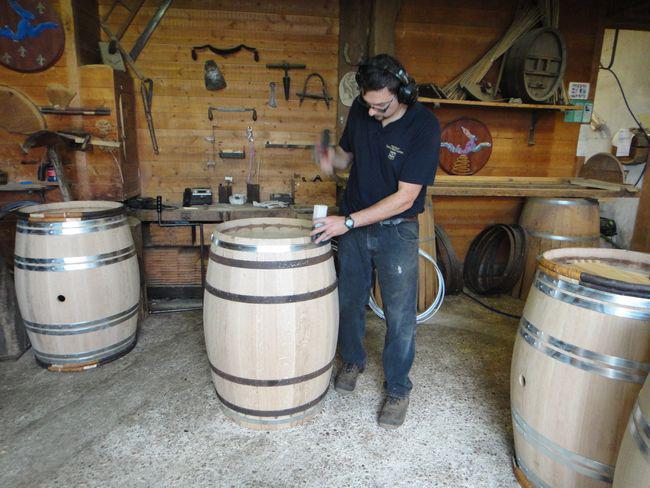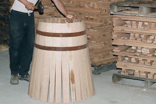 經(jīng)過干燥的橡木,裁成中間寬末端窄的木條,便可開始木桶的組合。一般一個橡木桶需要32片左右的木條,其中較寬的一塊將來會穿一個裝酒的孔。組成裙?fàn)畹哪緱l會先用鐵圈固定住一端。由于橡木加熱之后彈性增加,所以散開的另一端在加熱后可以彎曲成弓狀,用鐵圈套住后橡木桶的雛形就大致完成。