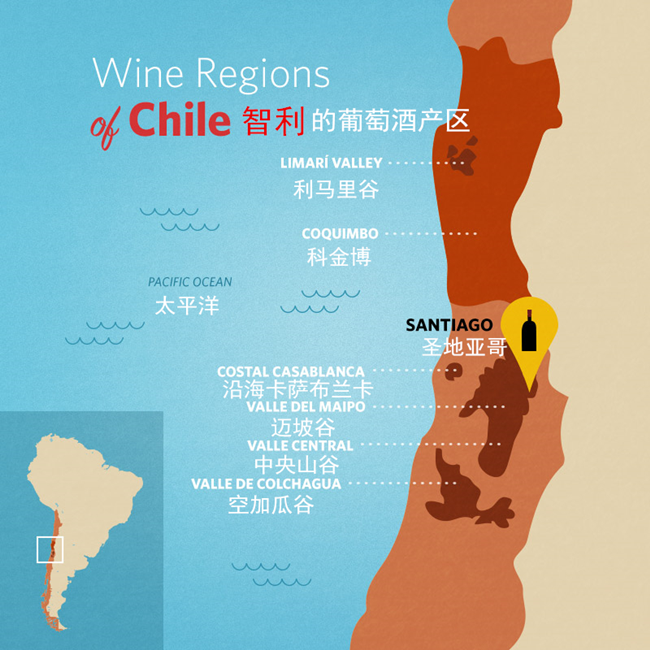 從首都圣地亞哥出發(fā),很快就能到達(dá)智利一些最為著名的葡萄產(chǎn)區(qū)。這些地區(qū)的葡萄種類繁多,既出產(chǎn)單一品種的葡萄酒,也出產(chǎn)混釀葡萄酒。在美國市場上,智利的葡萄酒一直都比較暢銷,其中空加瓜谷、中央山谷(Valle Central)和邁坡谷是智利銷量最大的三個(gè)產(chǎn)區(qū)。
