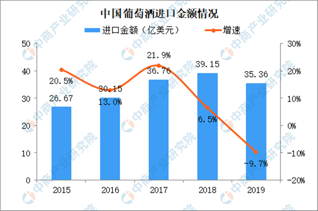 2015-2019年葡萄酒進(jìn)口金額持續(xù)增長(zhǎng),2019年葡萄酒進(jìn)口金額逼近40億美元。2019年葡萄酒進(jìn)口金額小幅下跌,進(jìn)口金額35.36億美元,同比減少9.7%。
