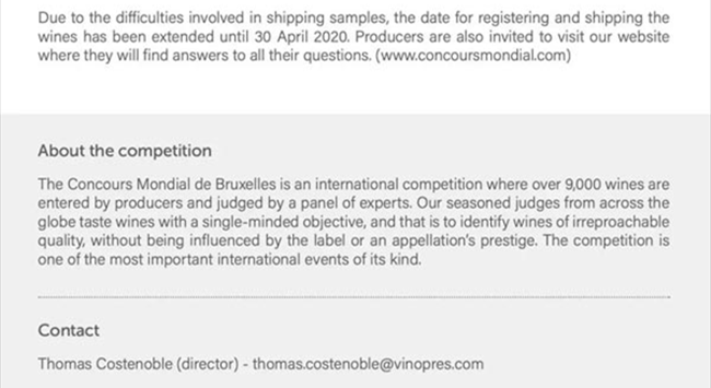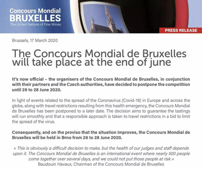 鑒于上述考量,2020年比利時(shí)布魯塞爾國(guó)際葡萄酒大獎(jiǎng)賽將延期至6月26日-28日在捷克布爾諾舉辦。