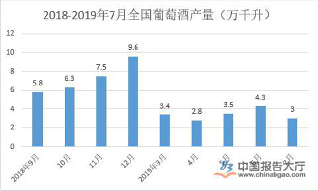 葡萄酒行業分析表示,根據國家統計局最新數據顯示,2018年全年全國葡萄酒產量達到了62.9萬千升,累計下降7.4%。截止至2019年6月全國葡萄酒產量為4.3萬千升,同比下降6.5%。累計方面,2019年1-6月全國葡萄酒產量達到24.5萬千升,累計下降19.9%。