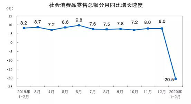 國內(nèi)自1月份開始受到疫情沖擊,生產(chǎn)消費幾乎冰凍。1-2月份,社會消費品零售總額52130億元,同比名義下降20.5%(扣除價格因素實際下降23.7%,以下除特殊說明外均為名義增長),較去年12月大幅下滑28.5和28.2個百分點,其中僅糧油食品、飲料、藥品等少數(shù)維持正增長。(數(shù)據(jù)來源:國家統(tǒng)計局)