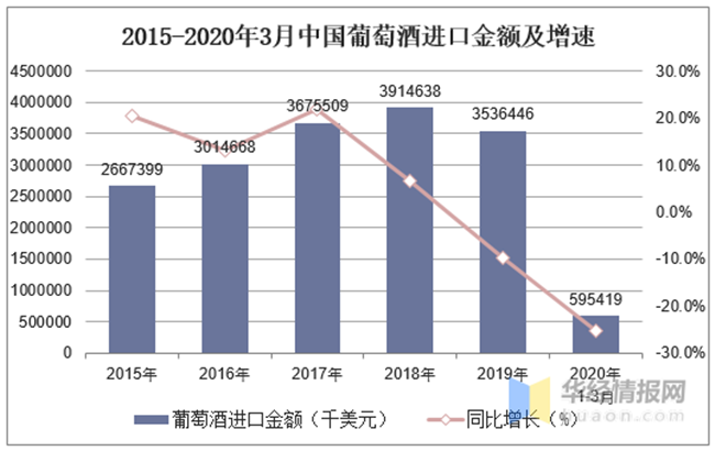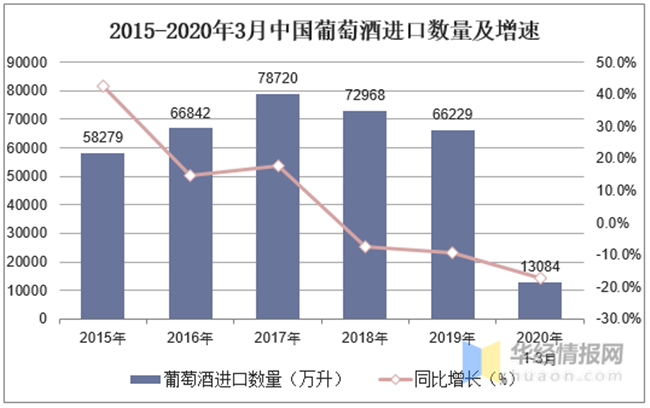 華經產業研究院數據顯示:2020年1-3月中國葡萄酒進口數量為13084萬升,相比上年同期減少了2778.2萬升,降幅為17.4%;進口金額為595419千美元,相比上年同期減少了208930千美元,降幅為25.1%;2020年1-3月中國葡萄酒進口均價為45.51千美元/萬升。