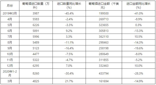 2020年3月中國葡萄酒進口數量為4825萬升,同比增長21.7%;進口金額為161694千美元,同比下降14.9%。