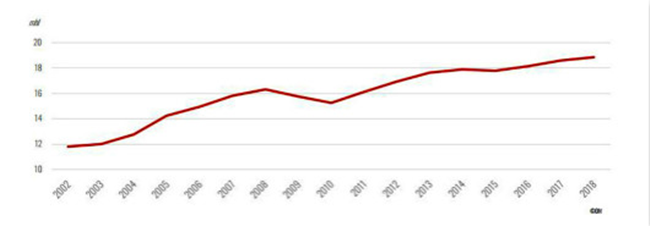 起泡葡萄酒占全球葡萄酒產量的份額(2002年-2018年)