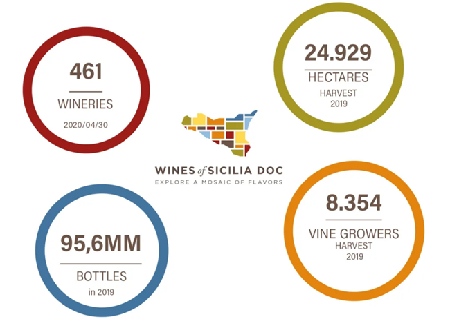 2011年11月22日,西西里法定產區(SICILIA DOC)由意大利農林部正式承認通過。2019年,帶SICILIA DOC標簽的有460多家酒莊,占約25,000公頃的葡萄園,8354位種植者,超9,500萬瓶的裝瓶量。