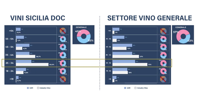 從參與西西里葡萄酒互動的用戶畫像上看,西西里法定產區葡萄酒的消費者要年輕很多,區間甚至低于整個葡萄酒消費的平均年齡段:25-34歲的人群非常集中。總體來說,消費者偏 "男性化",但在18-34歲的年輕群體中,女性消費者則更為突出。