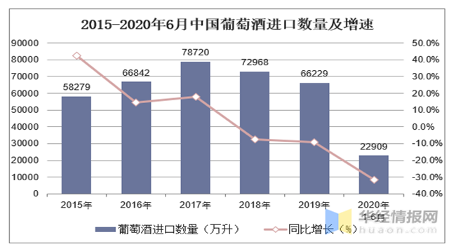 2015-2020年6月中國(guó)葡萄酒進(jìn)口數(shù)量及增速