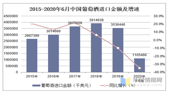 2015-2020年6月中國(guó)葡萄酒進(jìn)口金額及增速
