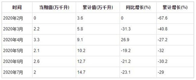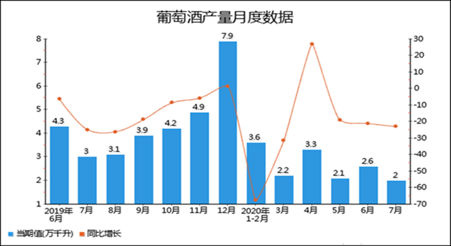 2020年7月全國葡萄酒產量為2萬千升,累計值為14.7萬千升,同比下降23.1%,累計下降29%。
