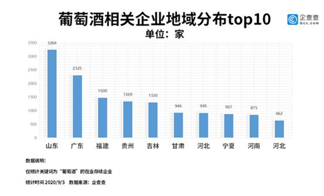從地域分布來看,我國葡萄酒相關(guān)的企業(yè)數(shù)量較多的地區(qū)是山東,共3266家,廣東、福建分別以2325家、1500家分列二三名,貴州、吉林、甘肅等地緊隨其后。