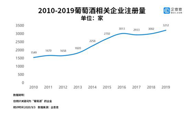 從企業(yè)發(fā)展情況來看,企查查數(shù)據(jù)顯示,過去十年來,我國葡萄酒相關(guān)的企業(yè)年注冊量平穩(wěn)上升。其中2013年至2016年注冊量增長較快,2016年注冊量首次突破3000家,此后幾年數(shù)據(jù)有所回落。2019年注冊量為3212家,同比增長7.0%。