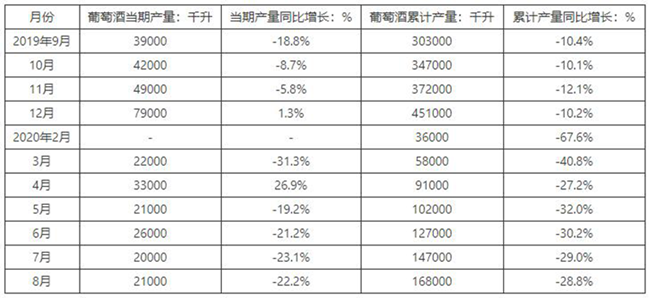 • 2020年1-8月中國葡萄酒產量及增速統計