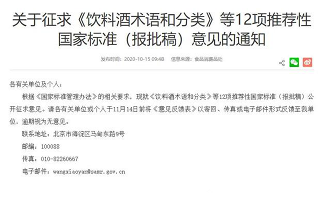 日前,國家市場監督管理總局發布了“關于征求《飲料酒術語和分類》等12項推薦性國家標準(報批稿)意見的通知”,根據《國家標準管理辦法》的相關規定,《飲料酒術語和分類》等12項推薦性國家標準已完成報批稿,涉及釀酒、鹽業、白酒等標準化技術委員會。