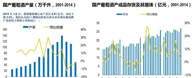 回顧國產葡萄酒的發展,在經歷近十年產量年均17%的高速增長后,2012年到達頂峰;行業收入在2001-2012年間年均復合增速達23%;2013年,經濟維持低景氣,“三公消費”限制加劇,行業量價齊跌,處于景氣低谷;同時產成品同比增速額和庫存壓力處于歷史高位,產量、行業收入和利潤均出現大幅下滑。但經過2014年的庫存消化,行業產成品存量增速逐步放緩,產量下降速度也開始減緩,收入和利潤出現回升。