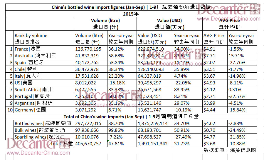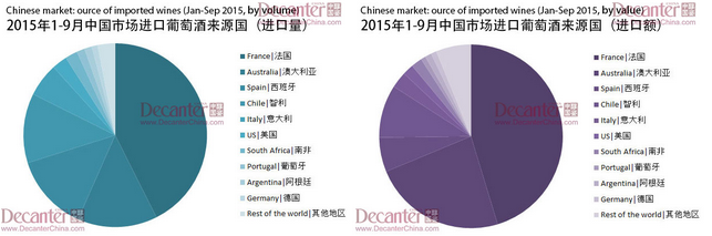 根據(jù)海關發(fā)布的數(shù)據(jù)顯示,今年一月到九月,中國市場瓶裝葡萄酒進口量同比上升38.7%,達3.0億升,進口額上升34.7%,達14億美元。其中,法國和澳大利亞葡萄酒進口增長顯著。這表示,中國進口葡萄酒市場在2015年前三季度強勢回暖。