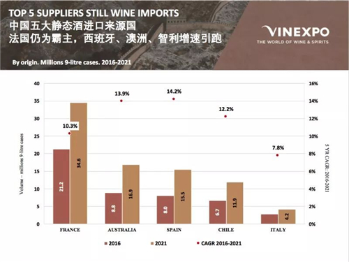 到2021年,在中國進口葡萄酒市場,法國仍占據霸主地位,而西班牙有望趕超智利成為第三大來源國。那么中國的前五大進口葡萄酒來源國仍然為法國、澳洲、西班牙、智利和意大利。