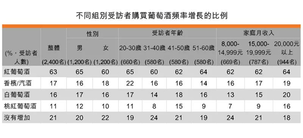 同時,家庭月收入越高,受訪者購買不同類別葡萄酒的比例也越高。例如家庭月收入在20,000元以上的受訪者曾購買白葡萄酒、香檳及起泡酒、桃紅葡萄酒的比例,明顯高于家庭月收入在8,000-14,999元的受訪者。