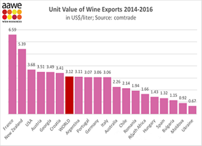 AAWE - 美國葡萄酒經(jīng)濟學家協(xié)會是一個享有聲望的組織,根據(jù)他們的評級,法國排名第一(6.59美元),其次是新西蘭(5.39美元),美國排名第三(3.68美元)。奧地利領(lǐng)先格魯吉亞,排名第四(3.51美元)。