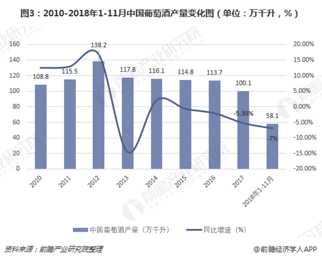 我國葡萄酒產量從2012年達到138.2萬千升的歷史高峰開始,一直在緩慢連續滑坡。根據國家統計局數據,2017年,全國葡萄酒產量100.1萬千升,累計下降5.3%;2018年1-11月,全國葡萄酒產量達58.1萬千升,累計下滑7%,若要趕超上年產量,12月的產量至少要達到42萬千升,而此數字比2018年前8個月的產量之和還多。結合目前數據看來,2018年國產葡萄酒產量大幅下滑已成定勢。