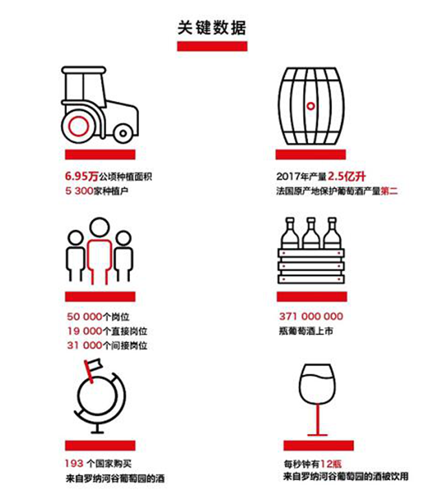 羅納河谷葡萄酒產(chǎn)區(qū)擁有6.95萬公頃種植面積,5300家種植戶。2017年份葡萄酒總產(chǎn)量達2.5億升,產(chǎn)量在法國AOC產(chǎn)區(qū)中排名第二,羅納河谷葡萄園的酒出口到193個國家,每秒鐘有12瓶來自羅納河谷葡萄園的酒被飲用。