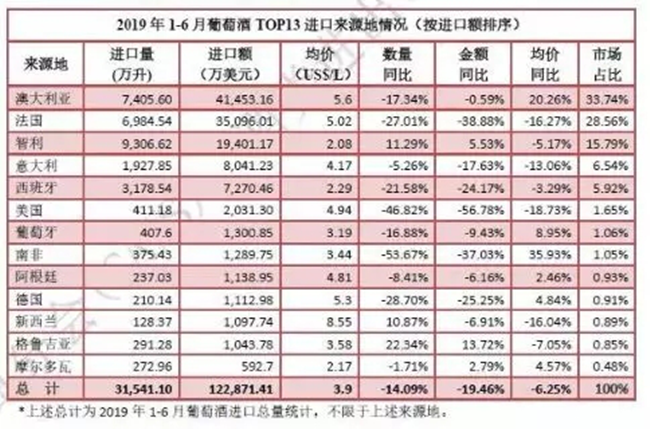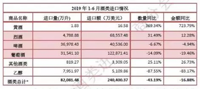 8月12日,中國(guó)食品土畜進(jìn)出口商會(huì)酒類進(jìn)出口商分會(huì)公布2019年1-6月酒類統(tǒng)計(jì)數(shù)據(jù),數(shù)據(jù)顯示,2019年上半年,進(jìn)口葡萄酒仍處低位,進(jìn)口量3.1億升,降幅進(jìn)一步收窄3%,進(jìn)口額12.3億美元,降幅基本持平。烈酒方面呈現(xiàn)逆市飄紅,進(jìn)口量實(shí)現(xiàn)超三成增長(zhǎng)。