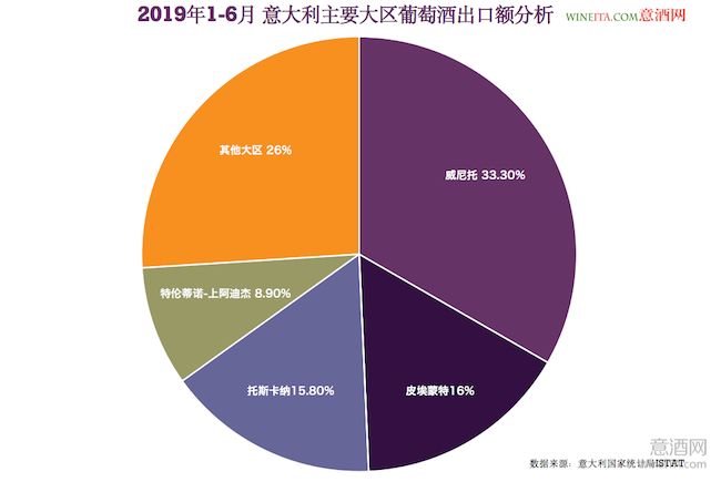 2019年上半年,意大利葡萄酒出口額最高的四個大區分別是威尼托(Veneto)大區、皮埃蒙特(Piemonte)大區、托斯卡納(Toscana)大區、和特倫蒂諾-上阿迪杰(Trentino-Alto Adige)大區。它們的葡萄酒出口總額接近23億歐元,占這段時間內意大利葡萄酒總出口額的76%