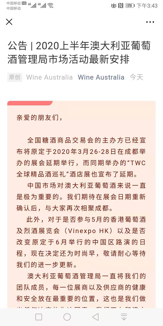 2月5日,澳大利亞葡萄酒管理局市場(chǎng)部總經(jīng)理Stuart Barclay在一份公告中表示,中國(guó)市場(chǎng)對(duì)澳大利亞葡萄酒來說一直是極為重要的。“我們期待在展會(huì)日期重新確認(rèn)后,與大家再次相聚成都。”