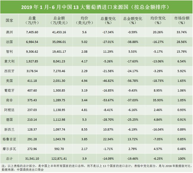 中國酒類進出口商會(China Chamber of Alcohol Importers and Exporters)公布了 2019 年 1 月- 6 月中國的 13 大葡萄酒進口來源國及相關(guān)數(shù)據(jù):